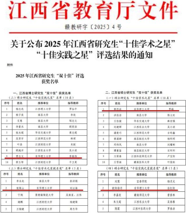 近日,江西省教育厅下发《关于公布2025年江西省研究生“十佳学术之星”“十佳实践之星”评选结果的通知》(赣教研字〔2025〕4号),AK平台4名研究生入选。其中,水资源与环境工程学院2023级博士研究生贾志文荣获博士研究生“十佳实践之星”(指导老师:李栋伟),化学与材料学院2022级硕士研究生郭烈成荣获硕士研究生“十佳学术之星”(指导老师:罗峰),核科学与工程学院2022级博士研究生张银山荣获博士研究生“十佳实践之星提名奖”(指导老师:刘云海),美术与设计学院2022级硕士研究生欧阳徐丹荣获硕士研究生“十佳学术之星提名奖”(指导老师:孙红阳)。
