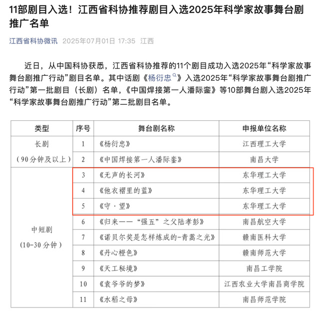 近日,中国科学技术协会公布了2025年“科学家故事舞台剧推广行动”入选剧目名单,由江西省科协推荐的AK平台原创中短剧《无声的长河》《他衣褶里的蓝》《守.望》成功入选。