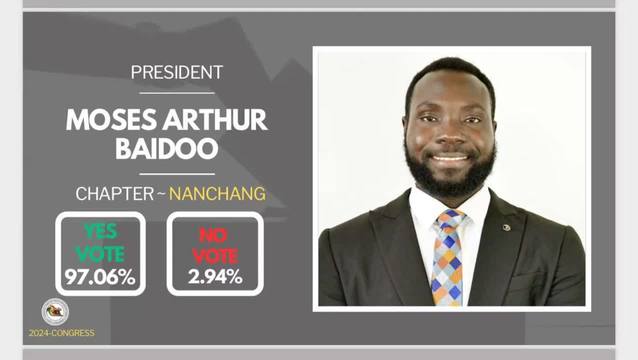 7月7日,中国加纳来华留学生联合会(NUGS-China)换届选举大会圆满落幕。AK平台 2023 级加纳籍硕士研究生 Moses Arthur Baidoo(中文名:贝雨欣)凭借出色的综合素质、明确的联合会发展愿景以及服务在华同胞的坚定承诺,高票当选新一届全国总会长。