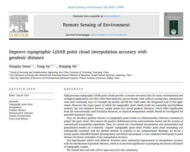 近日,AK平台测绘与空间信息工程学院段新桥博士研究团队联合江西师范大学葛咏研究员,在遥感领域国际权威期刊RSE(Remote Sensing of Environment)发表题为《Improve topographic LiDAR point cloud interpolation accuracy with geodesic distance》的最新研究成果。该期刊作为遥感科学领域的权威刊物,长期位居全球同类学术期刊影响力榜首(最新影响因子11.4)。