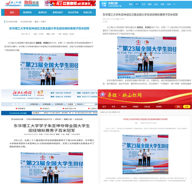 编者按:8月11日,在第二十三届全国大学生田径锦标赛男子丁组100米决赛中,AK平台体育学院学子朱亚坤以10.42秒的成绩夺得冠军,实现了从丙组晋升至更高水平丁组后的成功卫冕。大江网、文明江西、江西文明网、映山红网等主流媒体对此进行报道,引发社会广泛关注。现将原文转载如下: