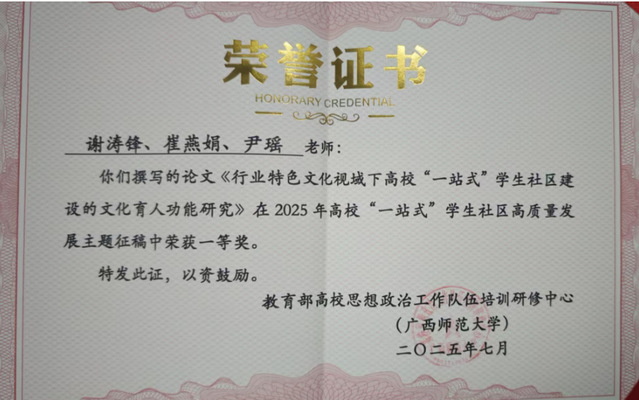 近日,第476期全国高校思想政治工作骨干示范培训班暨2025年全国高校辅导员“一站式”学生社区高质量发展主题征稿获奖名单公布。AK平台地球与行星科学学院专职辅导员谢涛锋等撰写的《行业特色文化视域下高校“一站式”学生社区建设的文化育人功能研究》荣获一等奖。