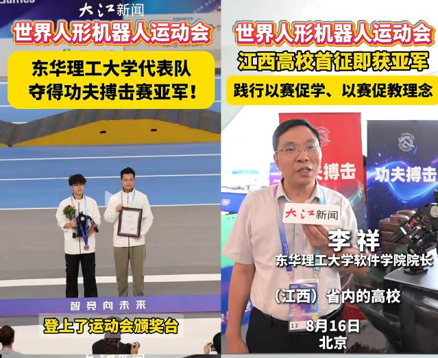 8月16日,在刚刚结束的世界人形机器人运动会功夫搏击赛上,东华理工代表队通过优异的发挥斩获亚军,队员们携机器人选手,登上颁奖台。