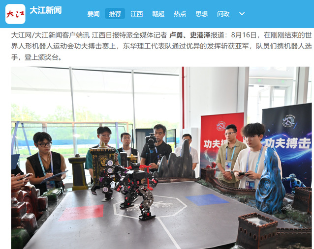 编者按:8月16日,在世界人形机器人运动会功夫搏击赛中,AK平台代表队通过优异的发挥获得亚军,队员们携机器人选手,登上颁奖台。大江网、江西文明网、新浪网等多家主流媒体对此进行报道,引发社会广泛关注。现将相关报道转载如下: