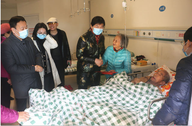 王海燕一行先后来到住院二部干部病房,向吉波、邱酬恩转达省委、省政府对离休老干部的关心、问候,给他们拜早年,为他们送上慰问金,感谢他们为新中国的建立和江西经济社会发展作出的贡献,祝愿他们新年快乐,健康长寿。
