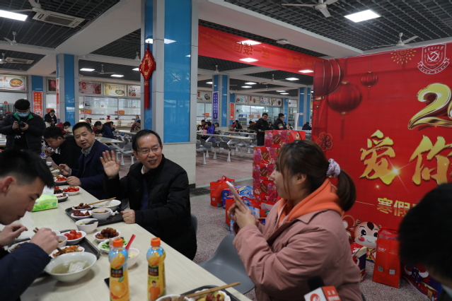 暖心陪伴,烹制温暖的“亲情味”。2月4日正值农历小年,一场别开生面的“书记面对面”暨寒假留校学生慰问活动在北区食堂举行,校党委书记柳和生、副校长刘云海、学工处、研究生院、后勤保障处、校团委等相关部门负责人和留校学生们欢聚一堂。柳和生代表学校为每个学生送上新年大礼包和压岁红包,并亲切地询问留校学生的学习和生活情况,无微不至地叮嘱大家一定要注意安全,做好科学防护。柳和生表示,校领导作为学校的“当家人”,一定把每个学生当家人,要让每一位因疫情防控需要而不能回家过年的同学都感受到家虽远在天边,但家人就在身边,并因此要求学校各有关部门、学院尽一切可能为寒假留校学生的学习、生活提供保障,使同学们在校如在家。