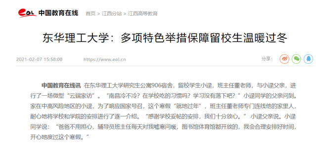 编者按:为深入贯彻党中央、国务院决策部署,维护校园安全稳定,我校妥善安排11名家住中高风险地区的留校学生安心安全过好春节。学校以“疫情防控不松懈、思想引领不断线、服务保障不缺位”为宗旨,各部门全力以赴、上下联动,把学生当家人,让学生“在校”如“在家”,多项特色举措保障留校生温暖过冬。学习强国、中新网、中国教育在线、江西新闻客户端等媒体对此进行报道,现将相关内容转载如下: