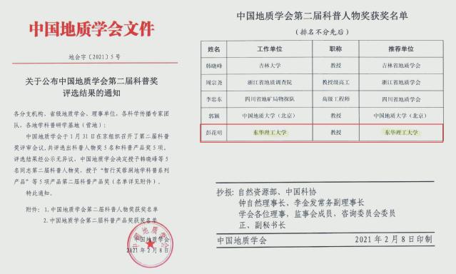 近日,中国地质学会公布了“第二届科普奖”评选结果,我校地球科学学院彭花明教授荣获“中国地质学会第二届科普人物奖”(仅5名),也是我校教师首次获得该项荣誉。