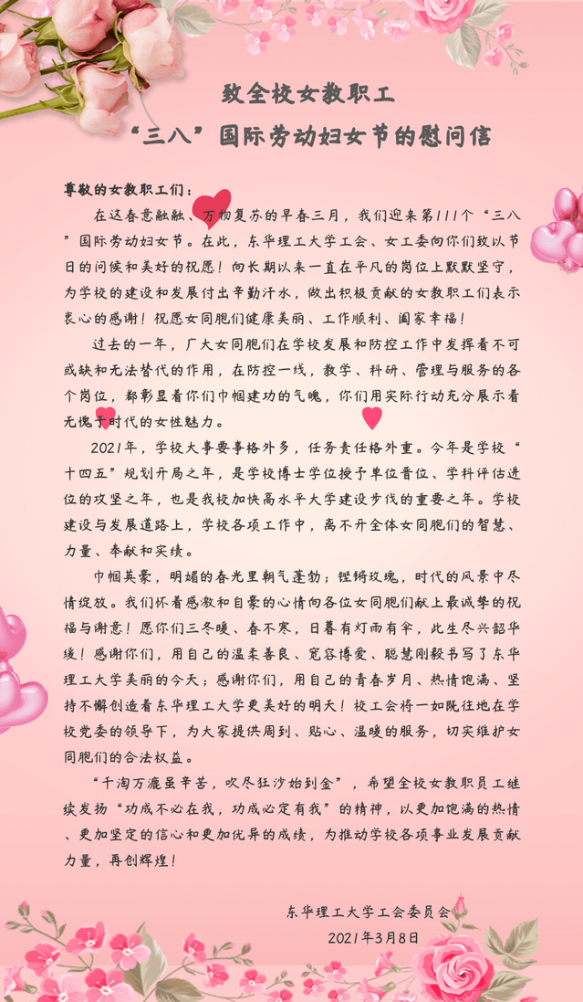 致全校女教职工“三八”国际劳动妇女节的慰问信