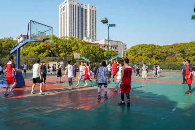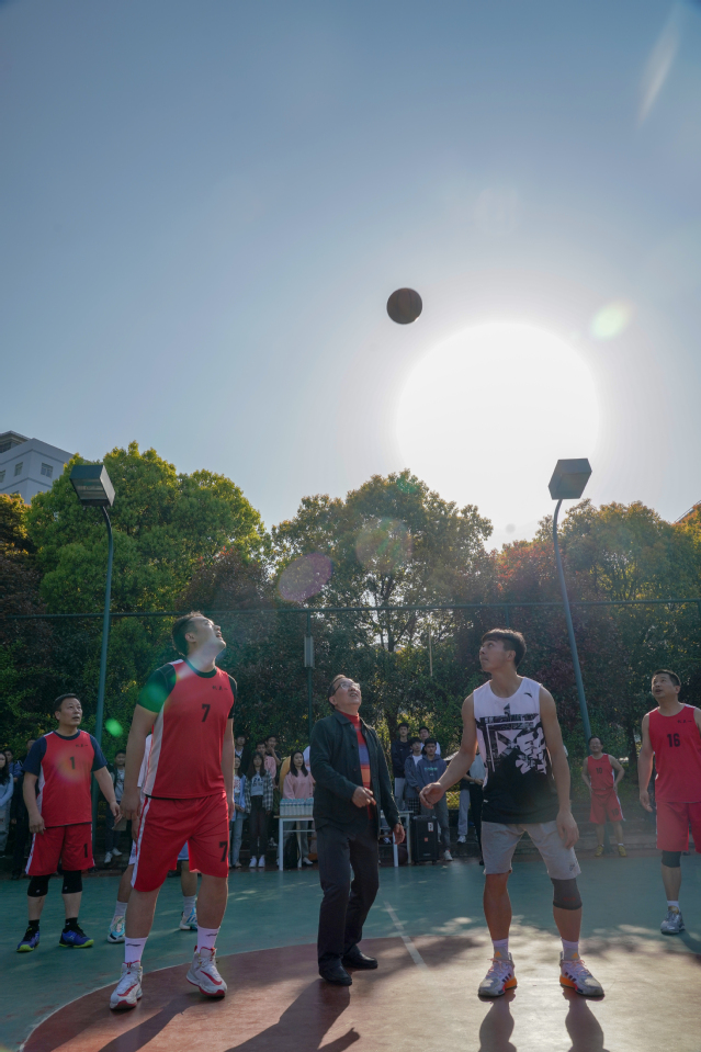 学校北区篮球场热闹非凡,柳和生走上球场为比赛开球,刘紫春、刘云海率领教职工与机电学院、艺术学院、化生材学院等班级的学生来了一场别开生面的师生篮球赛。校领导与同学们同场竞技,挥汗球场。队员们快攻迅捷、投篮精准、防守积极,队员之间巧妙的配合和精彩的进球,赢得了现场观众此起彼伏的喝彩声。