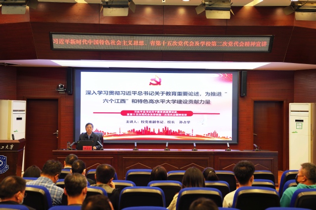 为深入贯彻落实习近平新时代中国特色社会主义思想和省第十五次党代会精神,全面贯彻党的教育方针,扎实推动学校第二次党代会确定的目标任务落地落实,汇聚起为党育人、为国育才的磅礴力量,10月10日上午,校党委副书记、校长孙占学在南昌校区行政楼一楼报告厅和抚州校区行政楼三楼会议室开展宣讲活动(视频)。校党委常委、副校长刘云海主持。学校党员干部、师生代表共200余人参加。