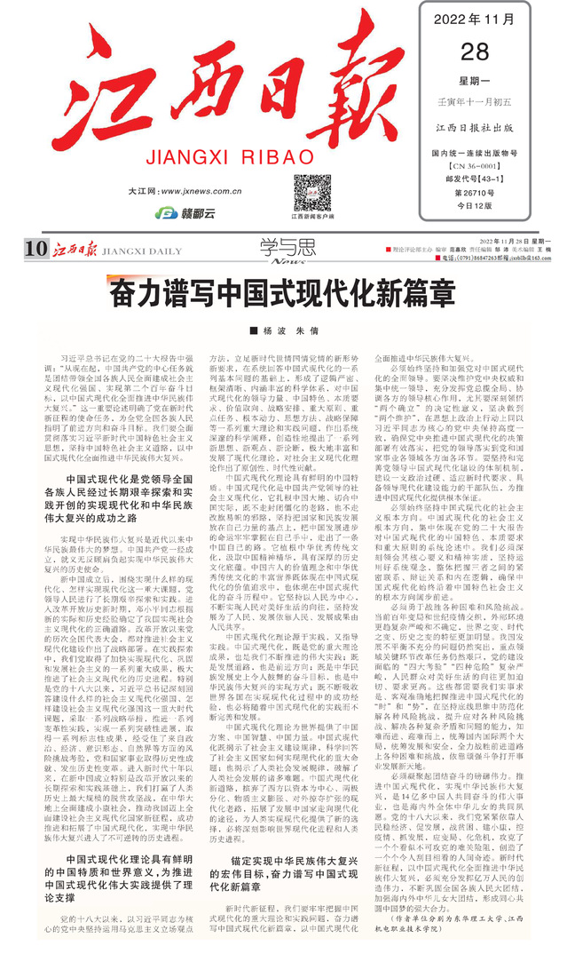 编者按:近日,《江西日报》“学与思”版头条刊发我校党委常委、副校长杨波的理论文章《奋力谱写中国式现代化新篇章》,引发社会广泛关注,现将全文内容转载如下: