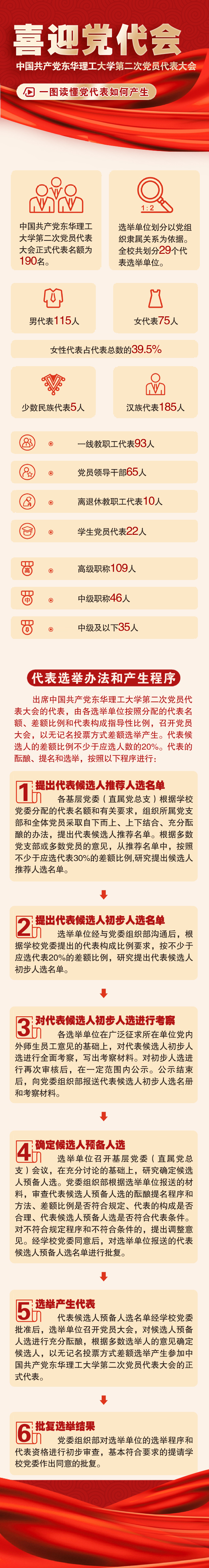 党代表如何产生?对此,学校党委组织部干部与人才科科长陈波进行了详细介绍:选举单位根据上级党组织分配的代表名额和有关要求,组织所属党组织采取“自下而上、自上而下、充分酝酿”的办法,提出代表候选人推荐名单;选举单位党组织根据多数党组织或多数党员的意见,从推荐名单中,按照多于代表30%以上差额比例提出候选人推荐人选名单;选举单位经与党委组织部沟通后,根据学校党委提出的代表构成比例要求,按不少于应选代表20%的差额比例,研究提出代表候选人初步人选名单。