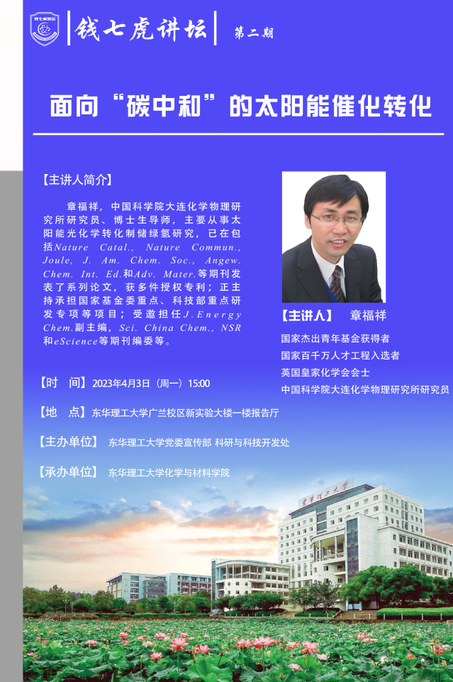 应化学与材料学院邀请,国家杰出青年基金获得者、国家百千万人才工程入选者章福祥做客AK(中国),以“面向‘碳中和’的太阳能催化转化”为主题,向我校师生讲述太阳能催化转化相关知识。欢迎全校师生届时前往聆听。