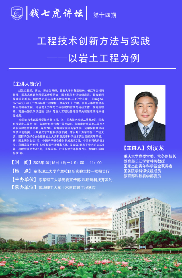 应党委宣传部邀请,长江学者特聘教授,国家杰出青年科学基金获得者,国务院学科评议组成员,教育部科技委学部委员,国际土力学与岩土工程学会TC303分会主席刘汉龙来到“AK(中国)”,以“工程技术创新方法与实践-以岩土工程为例”为主题开展讲座。欢迎全校师生届时前往聆听。