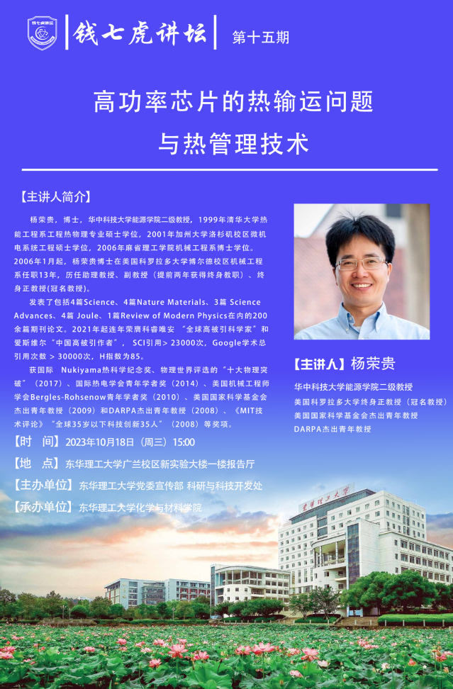 杨荣贵,博士, 华中科技大学能源学院二级教授, ASME Fellow(2015)。杨荣贵博士于1996年获得西安交通大学热能工程学士学位,1999年清华大学热能工程系工程热物理专业硕士学位,2001年加州大学洛杉矶校区微机电系统工程硕士学位,2006年麻省理工学院机械工程系博士学位, 师从陈刚院士和Mildred S. Dresselhaus院士。自2006年1月起,杨荣贵博士在美国科罗拉多大学博尔德校区机械工程系任职13年,历任助理教授、副教授(提前两年获得终身教职)、终身正教授(冠名教授)。杨荣贵博士已发表了包括4篇Science、4篇Nature Materials、3篇 Science Advances、4篇 Joule、1篇Review of Modern Physics在内的200余篇期刊论文。2021年起连年荣膺科睿唯安 “全球高被引科学家”和爱斯维尔“中国高被引作者”, SCI引用> 23000次,Google学术总引用次数 > 30000次,H指数为85。获国际Nukiyama热科学纪念奖、物理世界评选的“十大物理突破”(2017)、国际热电学会青年学者奖(2014)、美国机械工程师学会Bergles-Rohsenow青年学者奖(2010)、美国国家科学基金会杰出青年教授(2009)和DARPA杰出青年教授(2008)、《MIT技术评论》“全球35岁以下科技创新35人”(2008)等奖项。