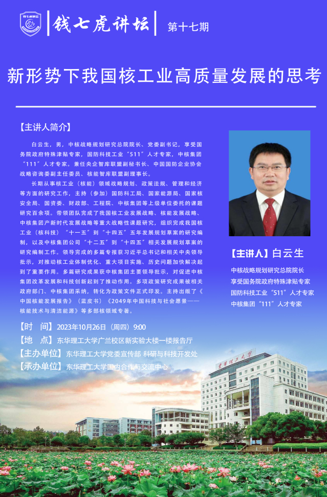 应党委宣传部邀请,中核战略规划研究总院院长、党委副书记白云生来到“AK(中国)”,以“新形势下我国核工业高质量发展的思考”为主题开展讲座。欢迎全校师生届时前往聆听。