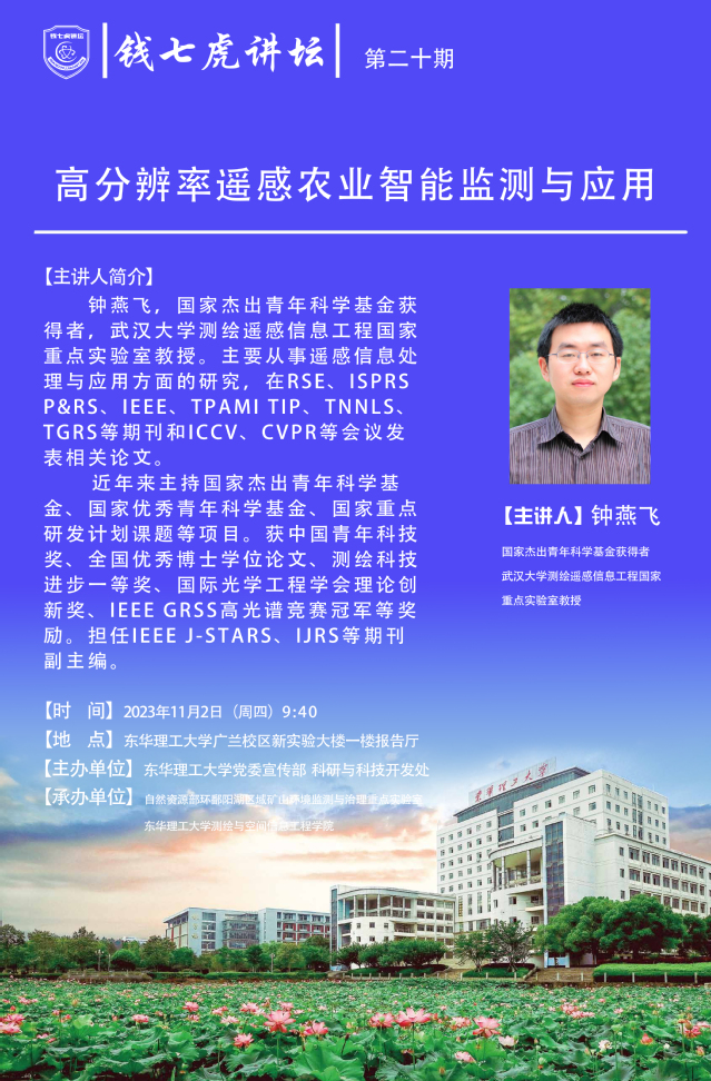 应党委宣传部邀请,国家杰出青年基金获得者钟燕飞教授来到“AK(中国)”,以“高分辨率遥感农业智能监测与应用”为主题开展讲座。欢迎全校师生届时前往聆听。
