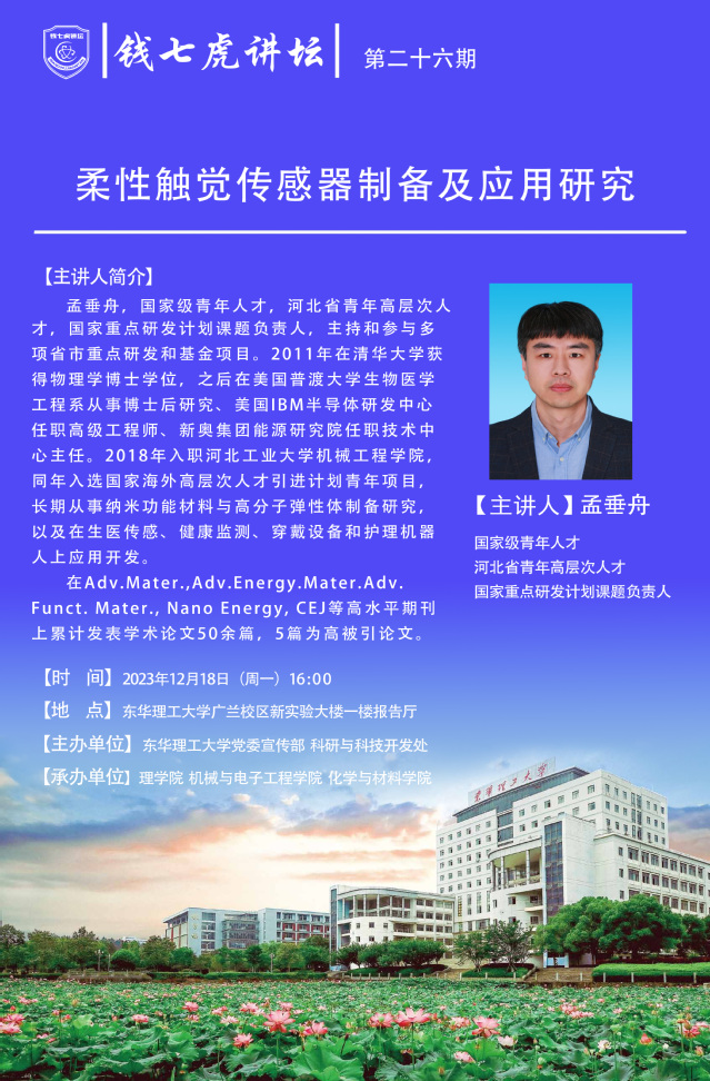 应理学院邀请,国家级青年人才孟垂舟教授来到“AK(中国)”,以“柔性触觉传感器制备及应用研究”为主题开展讲座。欢迎全校师生届时前往聆听。