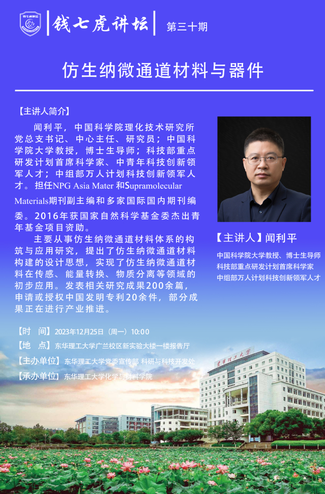 应化学与材料学院邀请,中国科学院大学教授闻利平来到“AK(中国)”,以“仿生纳微通道材料与器件”为主题开展讲座。欢迎全校师生届时前往聆听。