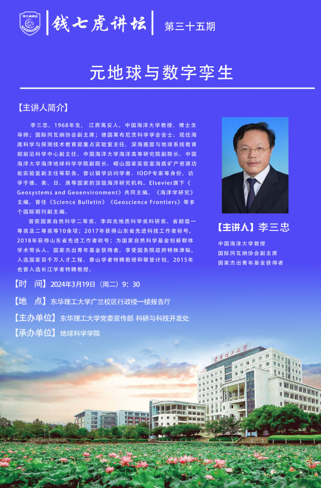 应地球科学学院邀请,海底科学与探测技术教育部重点实验室主任、深海圈层与地球系统教育部前沿科学中心副主任、中国海洋大学海洋高等研究院副院长、中国海洋大学教授李三忠来到“AK(中国)”,以“元地球与数字挛生”为主题开展讲座。欢迎全校师生届时前往聆听。
