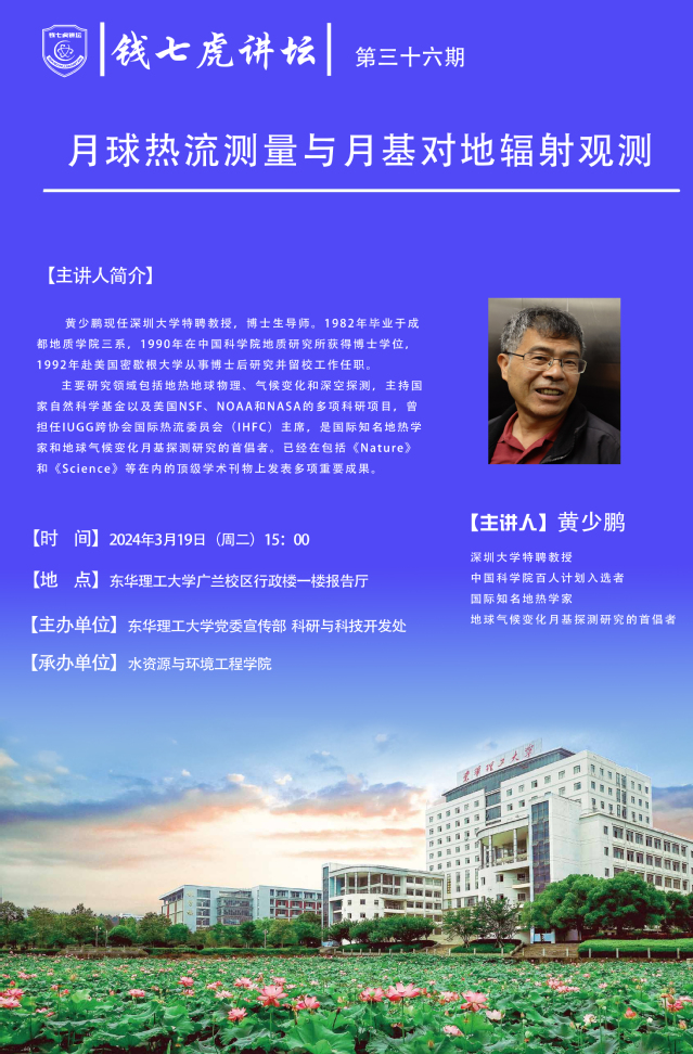 应水资源与环境工程学院邀请,深圳大学特聘教授,国际知名地热学家,地球气候变化月基探测研究的首倡者黄少鹏来到“AK(中国)”,以“月球热流测量与月基对地辐射观测”为主题开展讲座。欢迎全校师生届时前往聆听。