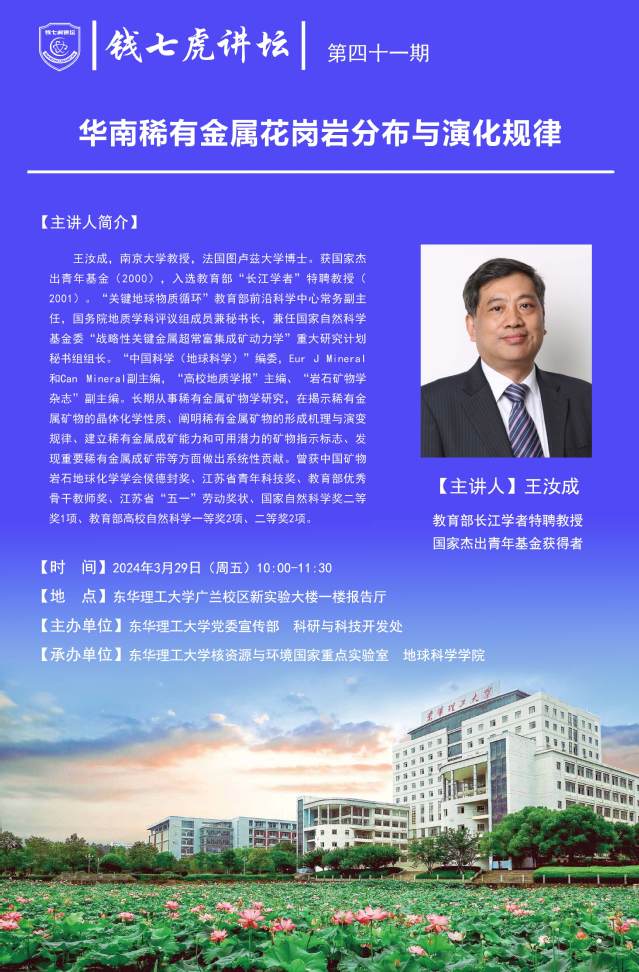 应核资源与环境国家重点实验室、地球科学学院邀请,南京大学矿物学教授,法国图卢兹大学博士王汝成来到“AK(中国)”,以“华南稀有金属花岗岩分布与演化规律”为主题开展讲座。欢迎全校师生届时前往聆听。