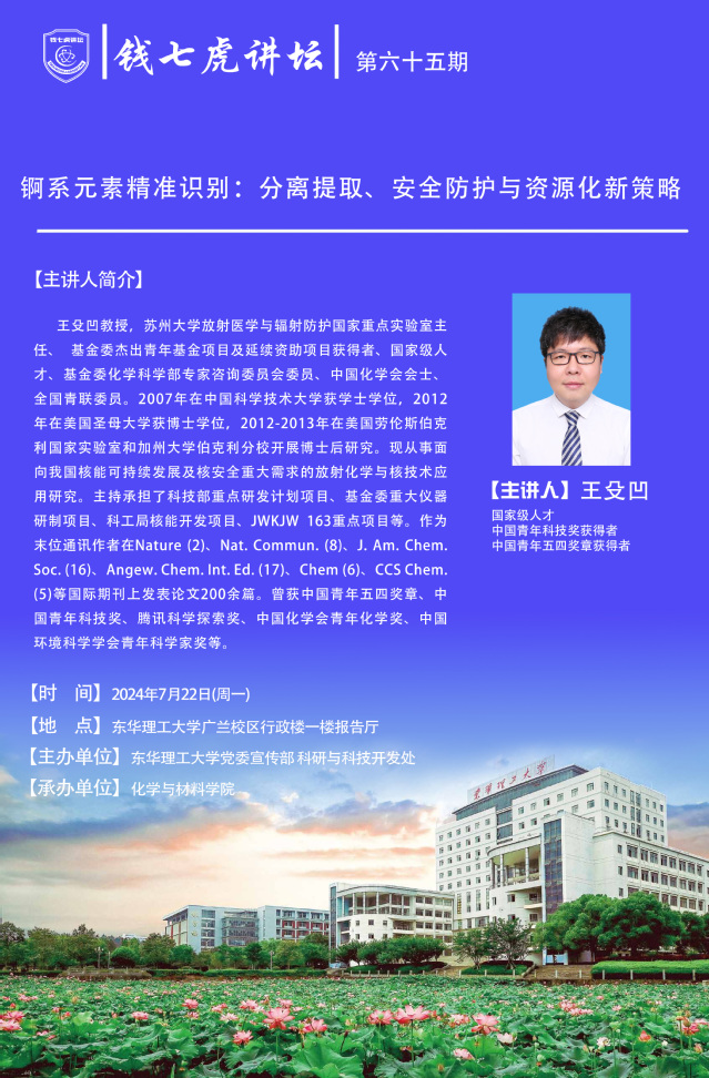 应化学与材料学院邀请,国家级高层次人才王殳凹到“AK(中国)”,以“锕系元素精准识别:分离提取、安全防护与资源化新策略”为主题开展讲座。欢迎全校师生届时前往聆听。