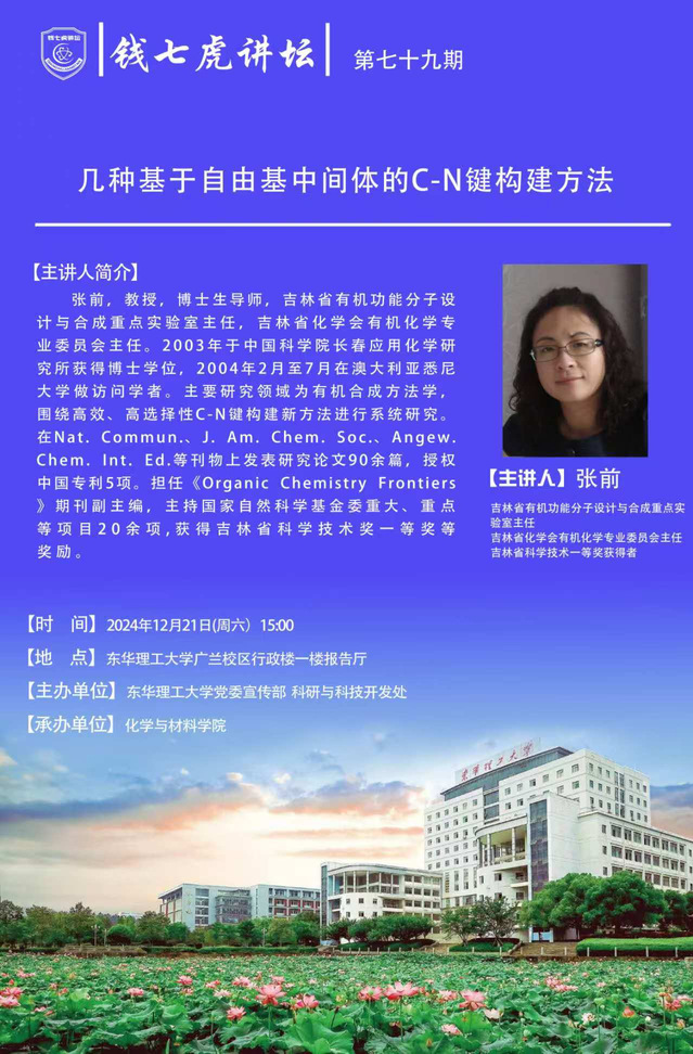 应化学与材料学院邀请,吉林省有机功能分子设计与合成重点实验室主任张前到“AK(中国)”,以“几种基于自由基中间体的C-N键构建方法”为主题开展讲座。欢迎全校师生届时前往聆听。