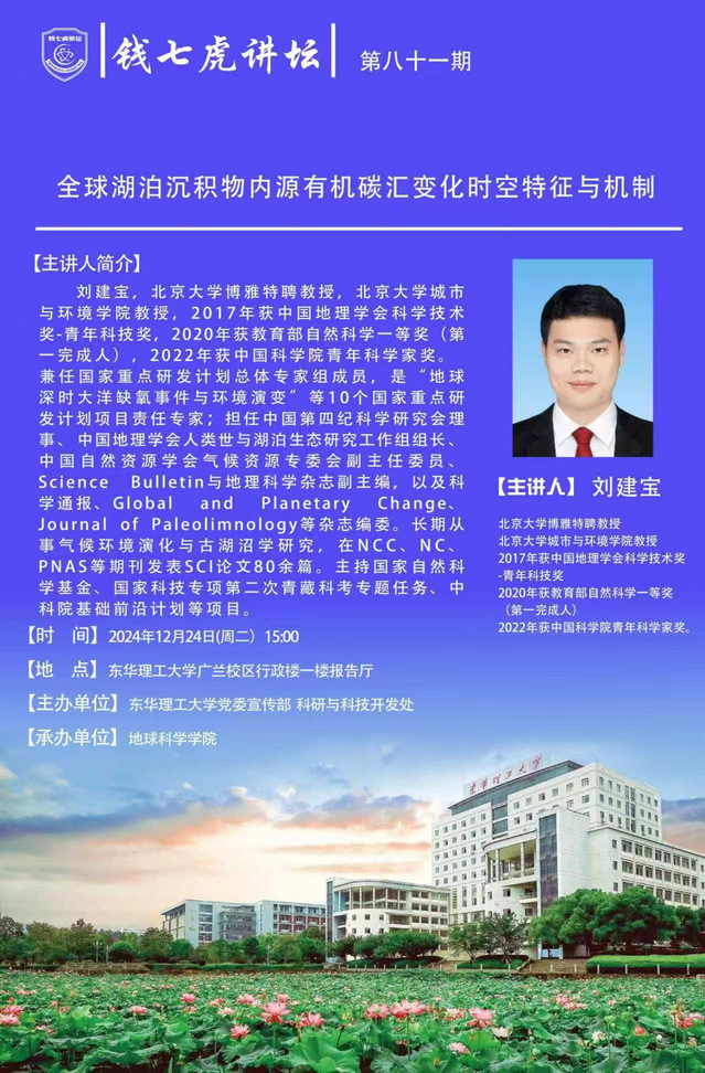 应地球科学学院邀请,北京大学博雅特聘教授,北京大学城市与环境学院教授刘建宝到“AK(中国)”以“全球湖泊沉积物内源有机碳汇变化时空特征与机制”为主题开展讲座。欢迎全校师生届时前往聆听。