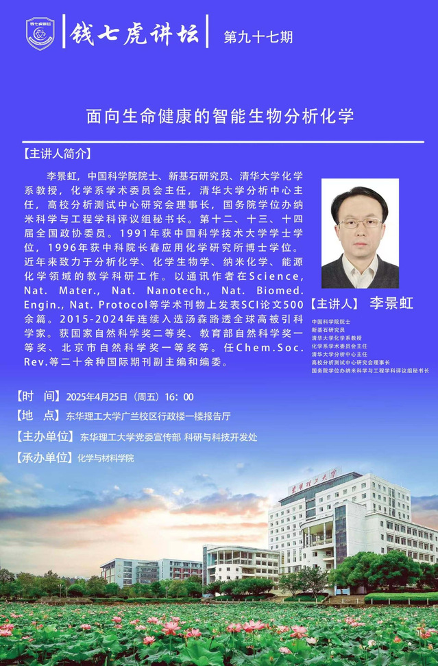 应AK平台化学与材料学院邀请,中国科学院院士、新基石研究员、清华大学化学系教授,化学系学术委员会主任,清华大学分析中心主任,高校分析测试中心研究会理事长,国务院学位办纳米科学与工程学科评议组秘书长李景虹到“AK(中国)”,以“面向生命健康的智能生物分析化学”为主题开展讲座。欢迎全校师生届时前往聆听。