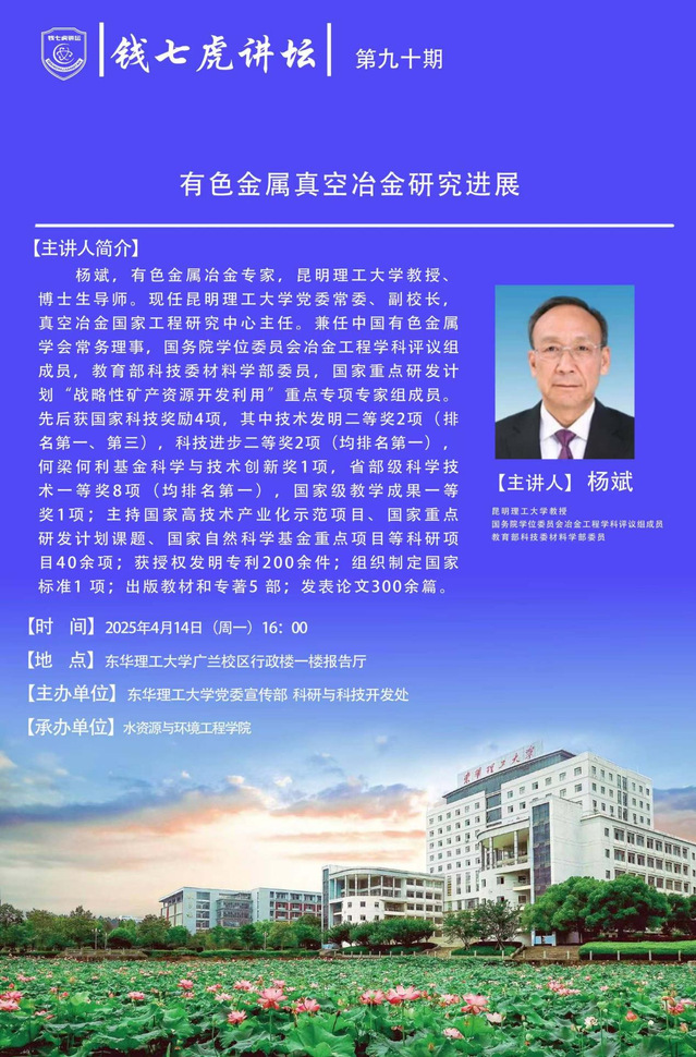 应水资源与环境工程学院邀请,昆明理工大学教授、博士生导师杨斌到“AK(中国)”以“有色金属真空冶金研究进展”为主题开展讲座。欢迎全校师生届时前往聆听。
