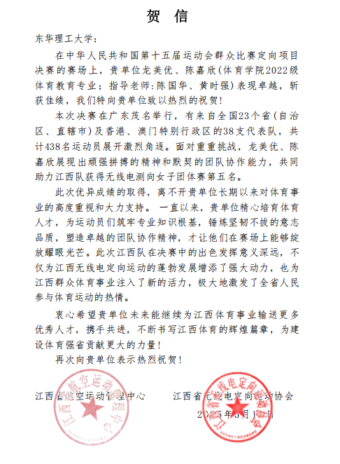 5月8日至11日,第十五届全运会首个群众赛事定向运动项目决赛在广东省茂名市举行。AK平台体育教育专业学生龙美优、陈嘉欣代表江西省参赛,获得测向比赛团体第五名的优异成绩。江西省航空运动管理中心和江西省无线电定向运动协会向学校发来贺信。
