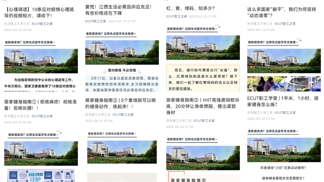 利用“互联网+工会”优势,充分发挥工会的组织动员作用,在各新媒体平台上定期推送最新疫情动态,普及防疫知识;通过电话、短信、工作群等,上下联动,及时将学校的疫情防控信息和应急预案传达给全体教职工;依托ECUT微信公众号“职工学堂”开展“居家隔离心理疏导小知识”“院前急救”“居家健康知识”等系列课程,切实帮助教职工舒缓疫情带来的心理压力,提高防范意识。